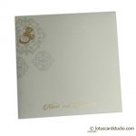 Floral wedding card rich with mantras made from Ivory Canvas texture paper. Envelope has Om symbol along with couple’s names and can be customized with your symbols and patterns. Main card has golden Om symbol with rhinestone and golden florals. Inserts in shimmer royal red and shimmer majestic blue raises the beauty of the invite.