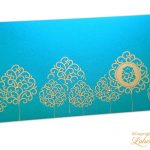 Money envelope made from cyan color, shimmer finish metallic paper. Envelope has golden beautiful trees design with Ganpati ji.