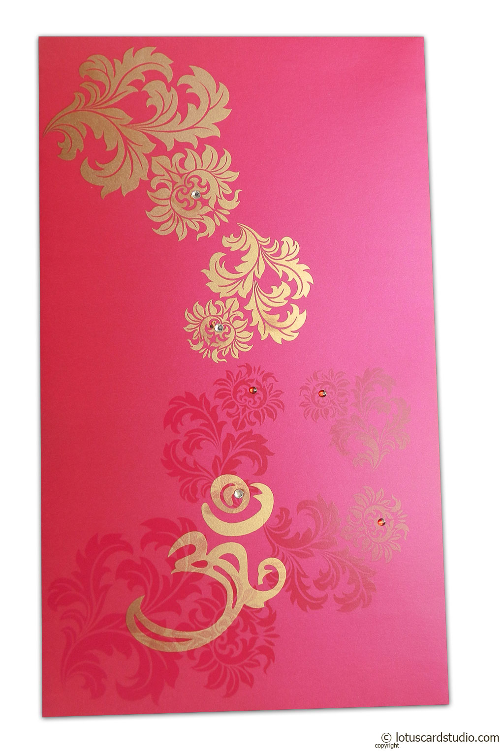 Card in paradise pink with golden swirl floral design is a treat to the eyes. Envelope is of same design. Card has a jacket with peacocks holding inserts. Inserts are in golden and silver that shimmers in light.
