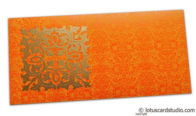 Shagun/money envelope made from yellowish orange metallic feel paper. Envelopes have beautiful big classy golden flower on the left along with soft texture all over.