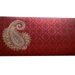 Gift envelope made from royal red color, shimmer finish metallic paper. Damask flowers are gloss printed all over and envelope has a beautiful golden paisley flower on left.