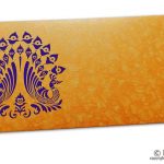 Money envelope made from orange color metallic paper with shimmer finish. Beautiful blue peacocks raise the impression of the envelope.