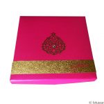 Get this elegant and beautiful pink and golden themed boxed wedding invitation card. Box and card have golden flower on top. Box has a golden strip at bottom. Card has designer inserts inside.