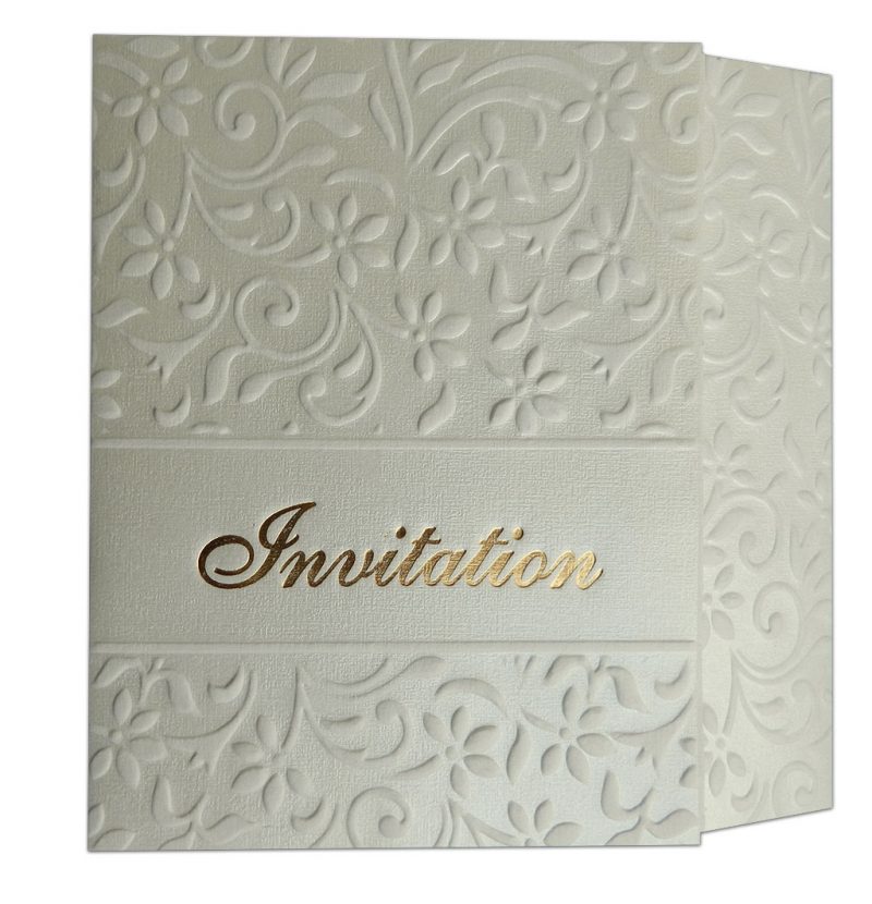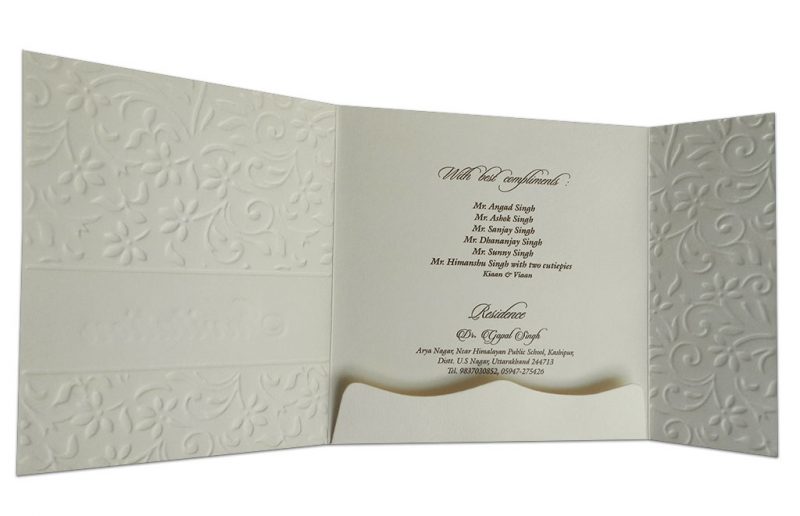 The card is delight to the eyes with embossed floral design with golden ‘Invitation’ wording. Envelope is matching with card with embossed design border. Inserts are in multi color that shimmers in light.