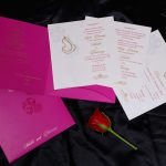 Wedding card in pink golden and red motif studded with white rhinestones and ganesh ji printed. Card is available with white colored inserts and motif printed.